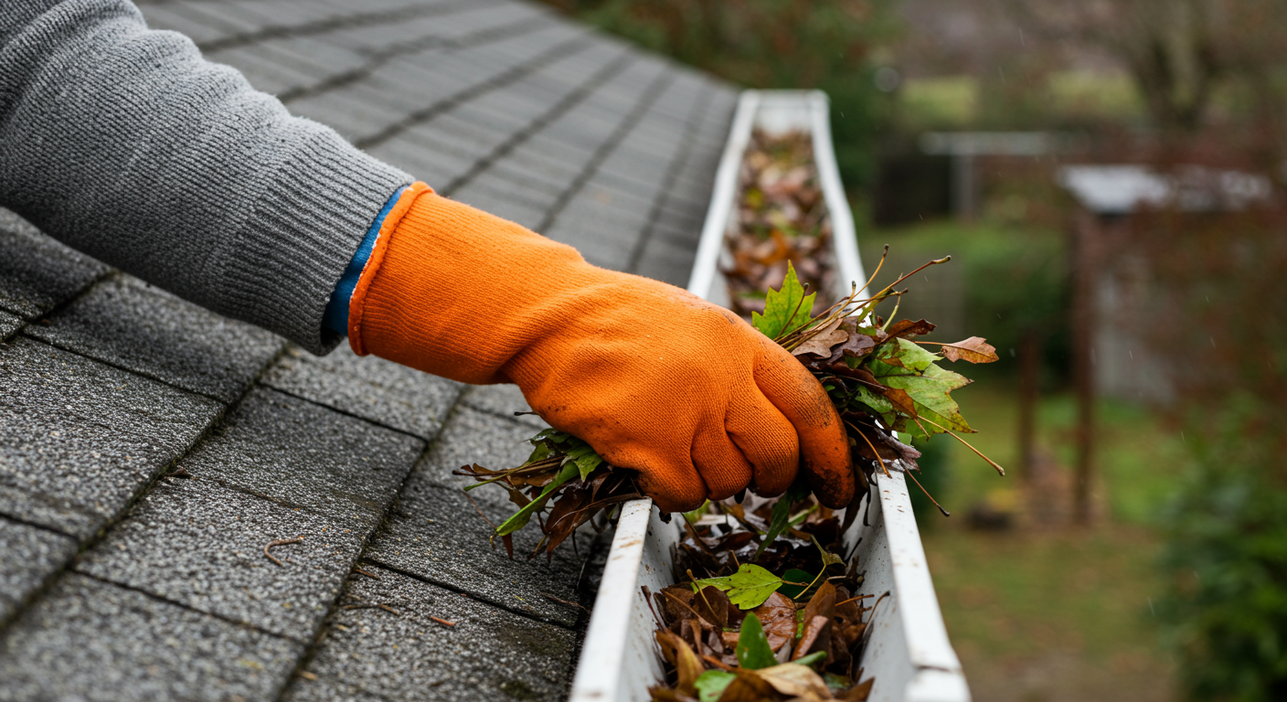 - Remove debris, leaves, and branches from gutters and downspouts to prevent clogging and water damage.