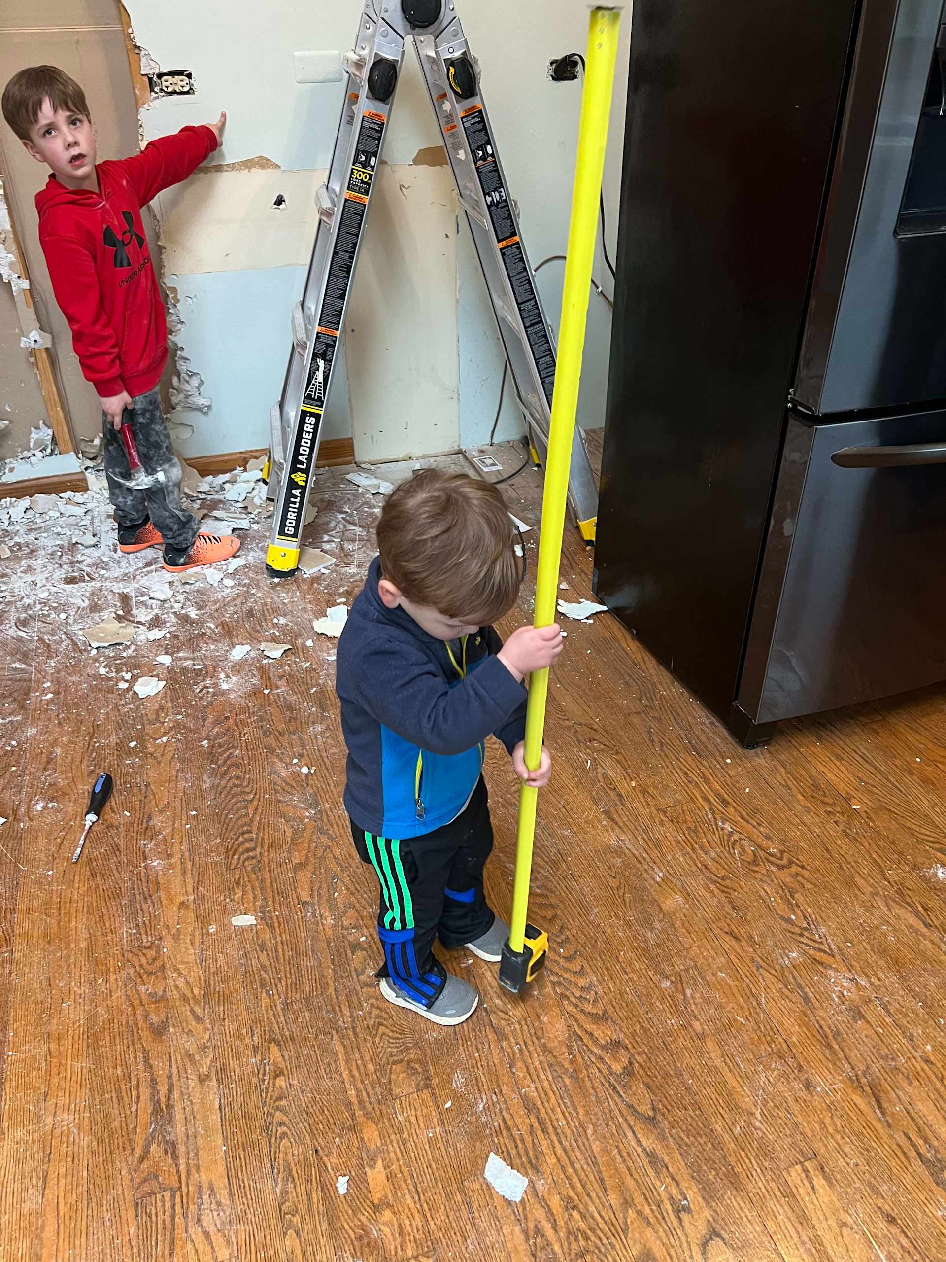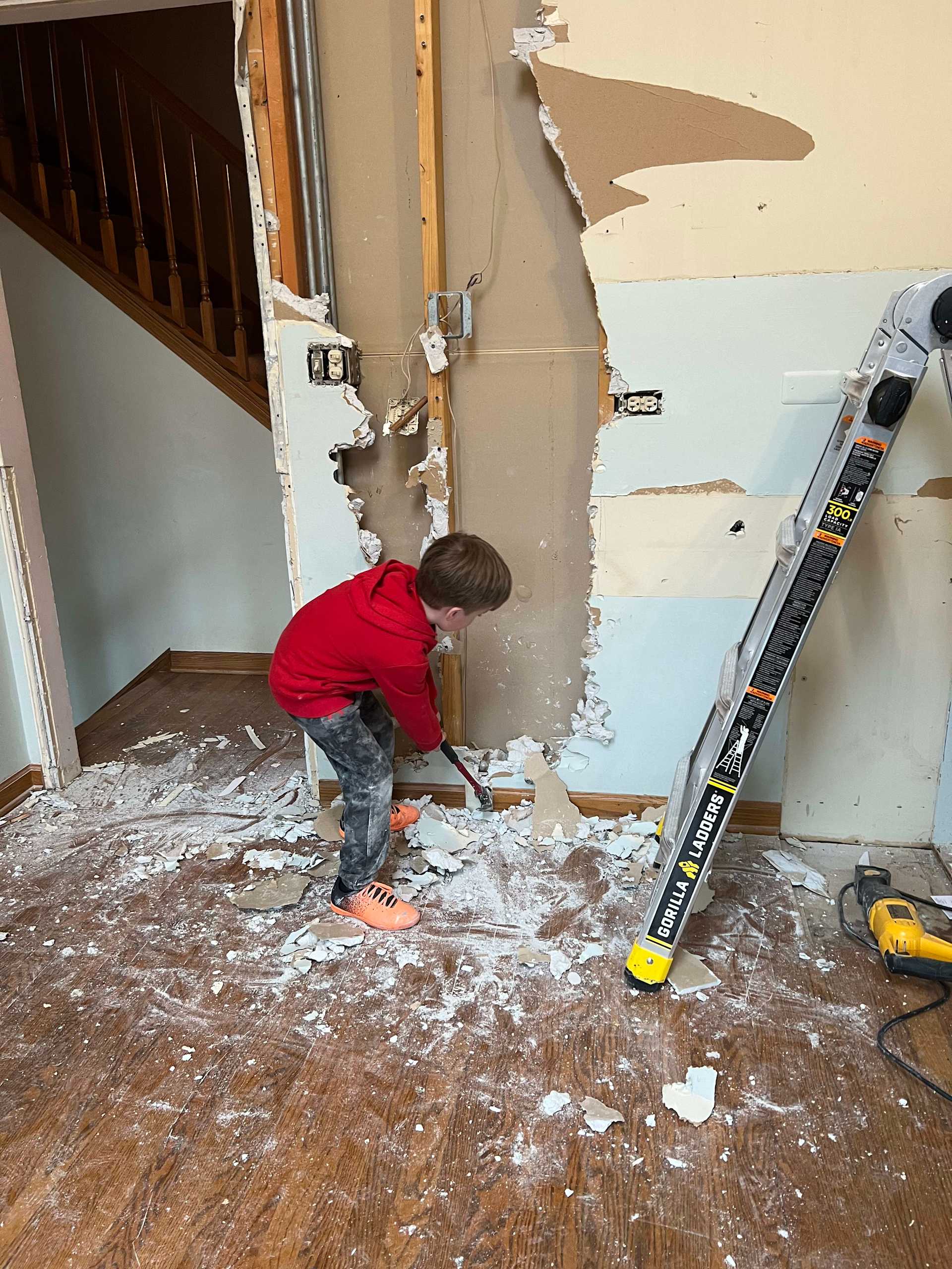 Photo Courtesy of Anna Messel - Owen and Connor Messel helping dad, Matt Messel, with demolition at an investment property!