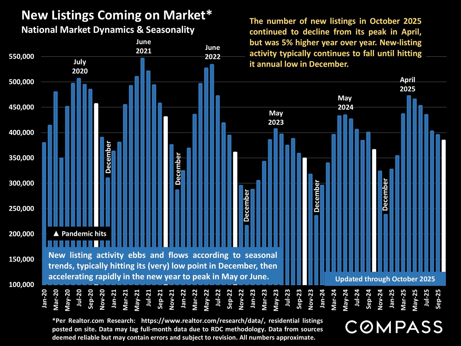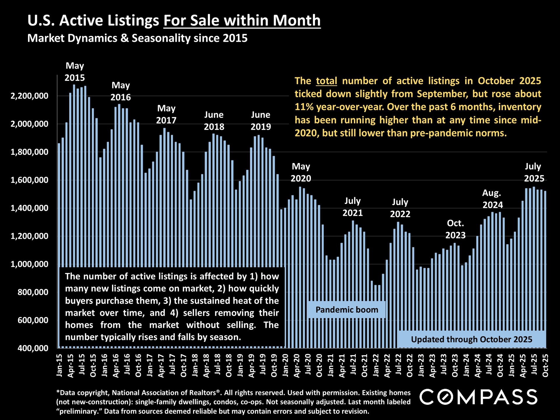 Year-over-year increases in active inventory have been slowing sharply, but October 2025 still posted an 11% increase compared to October 2024. National inventory is now at its highest point since 2020, though still below long-term norms.