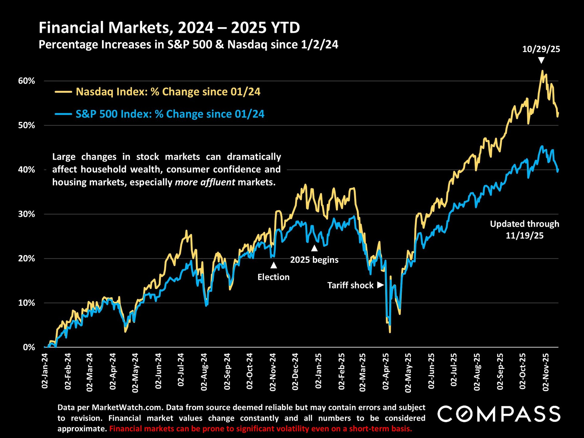 Stock markets, meanwhile, have been volatile since their late-October highs, reflecting broad economic uncertainty as investors attempt to anticipate the Federal Reserve’s next steps. The Fed has implemented only two small rate cuts in 2025 to date, and projections for December—as well as 2026—vary widely. Employment and unemployment trends will be key indicators the Fed continues to monitor.