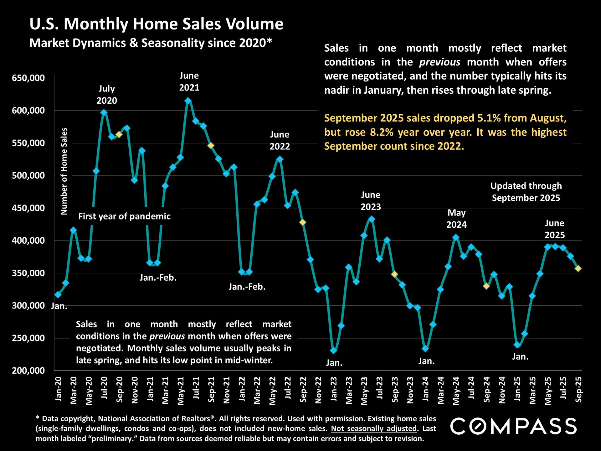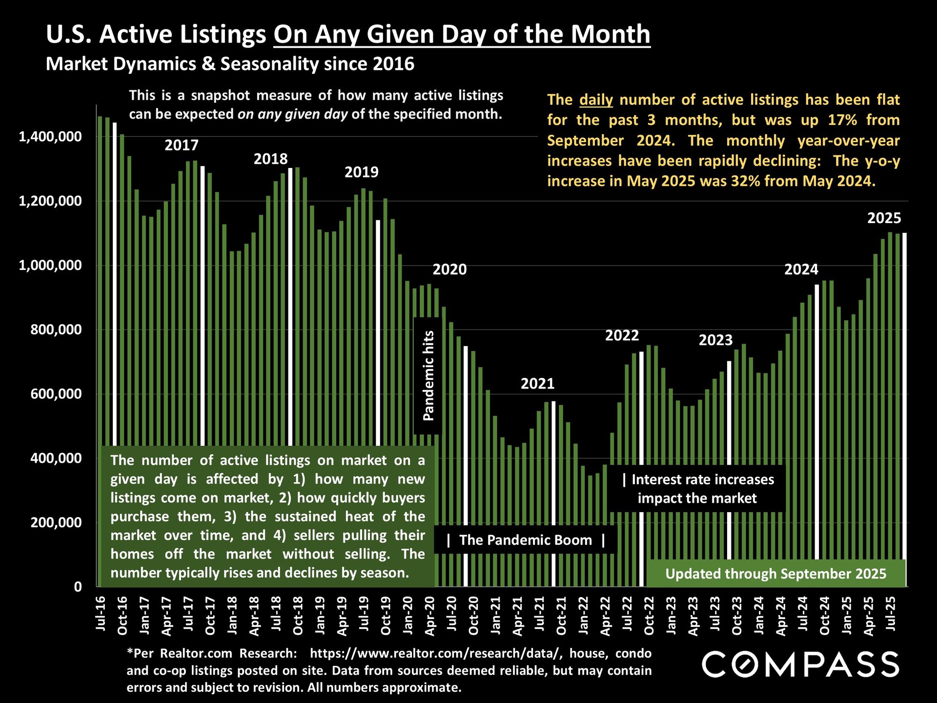 Inventory remains one of the defining stories of the year. While the number of active listings in September was up 17% from September 2024, it stayed relatively flat compared to July and August. This marks the highest level of available inventory since 2019, though the pace of increase has begun to slow.