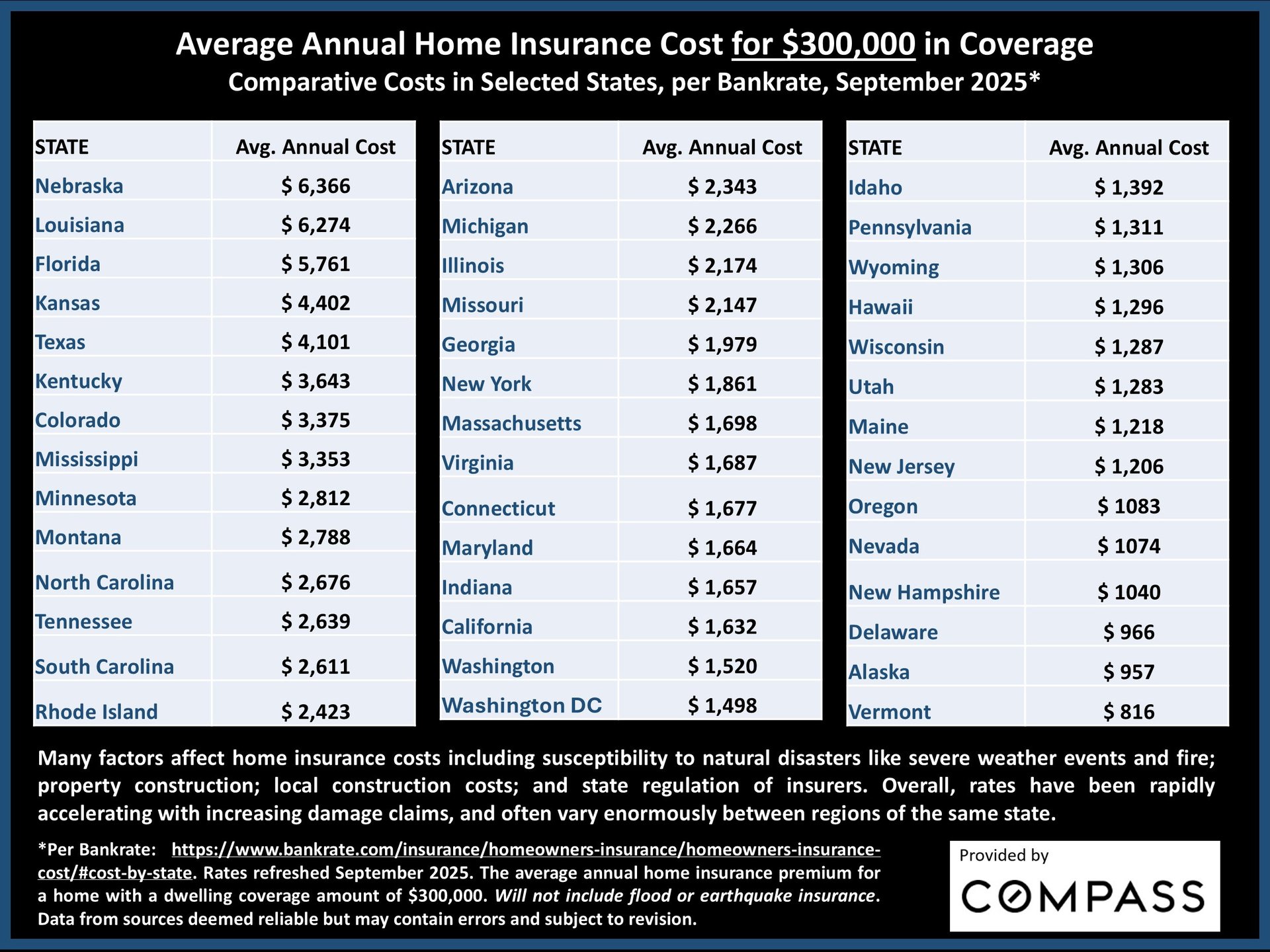 Another notable trend this year has been the sharp rise in homeowner’s insurance premiums. Across most states, average annual costs for $300,000 in coverage have climbed rapidly and are expected to continue doing so. Rates vary dramatically by region, influenced by local construction costs, weather risk, and regulatory factors.