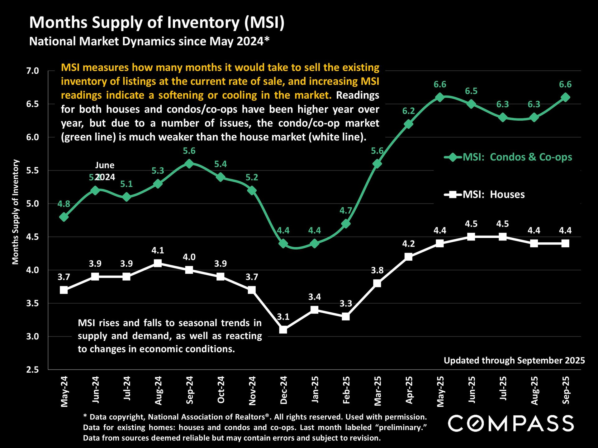 The months-supply-of-inventory (MSI) metric—used to gauge the balance between supply and demand—remains elevated year-over-year. Detached single-family homes continue to show stronger demand compared to the condo and co-op market, where conditions have softened more notably.