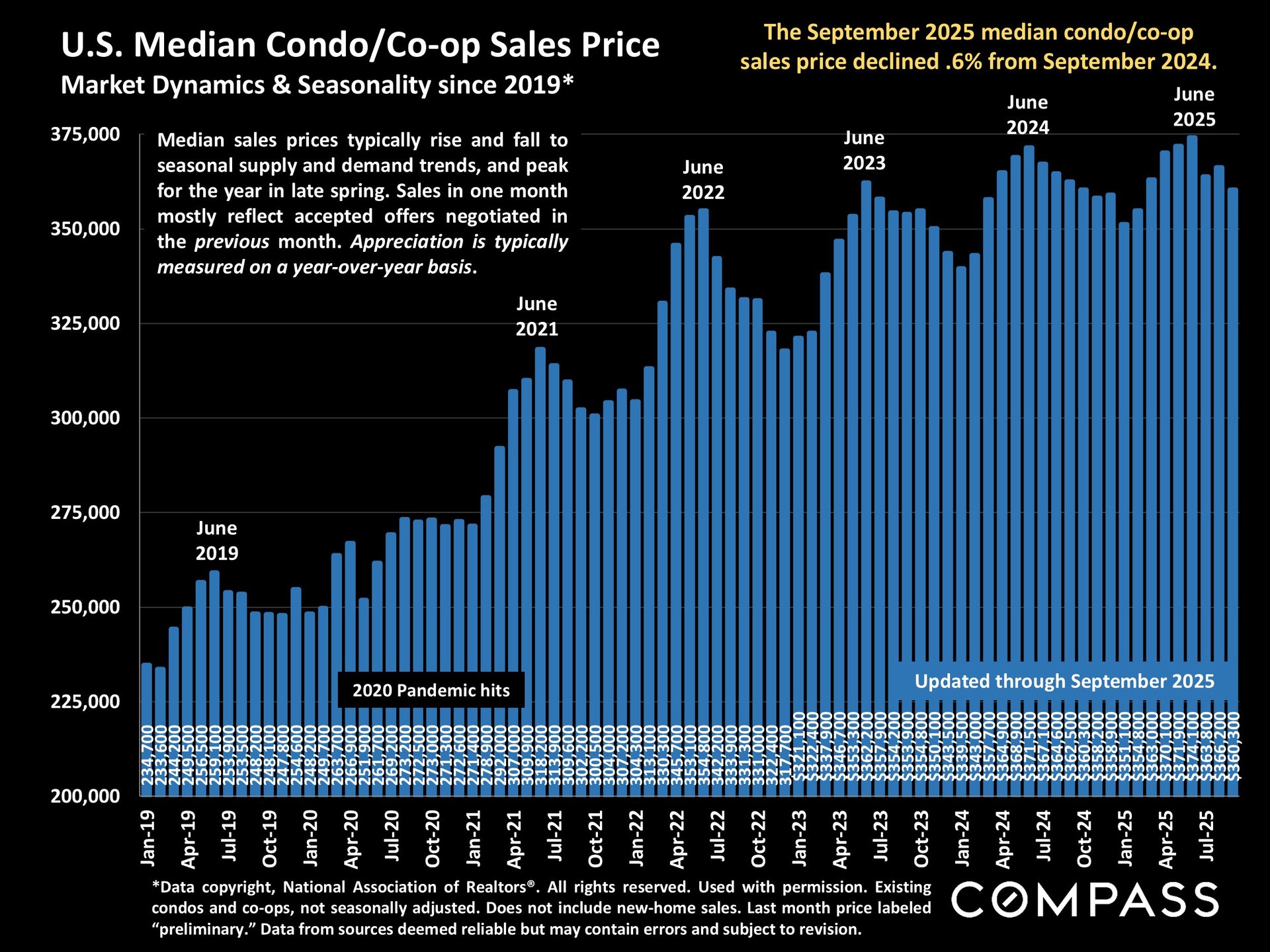 After peaking in June, median home prices have eased slightly. Year-over-year, the median single-family home price is up 2.3%, while condo and co-op prices are down just 0.6%.