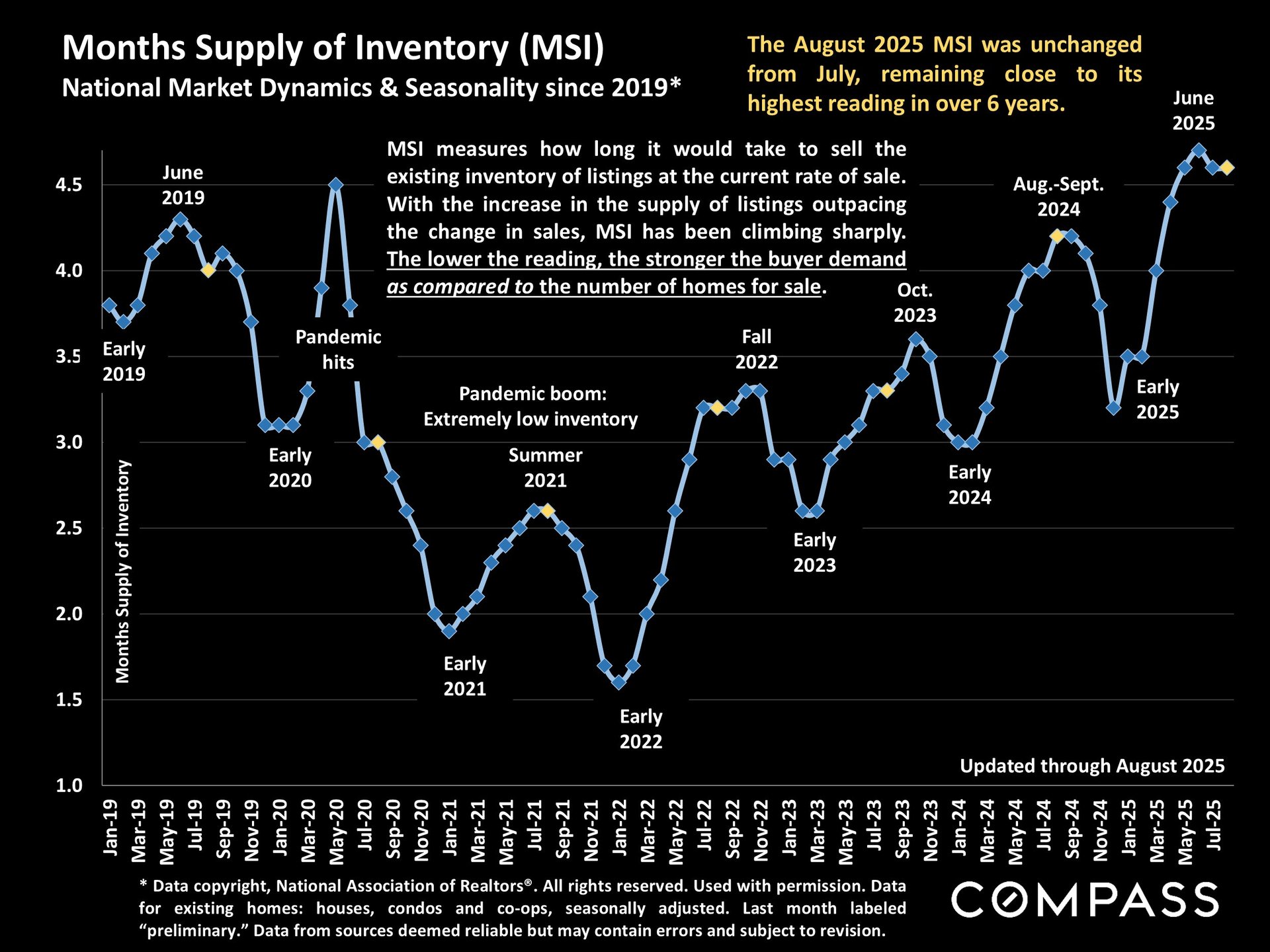 This expanding inventory has created more balance between buyers and sellers. The months-supply-of-inventory (MSI)—a key measure of how long it would take to sell all current listings at the existing sales pace—is now at a six-year high. While this still varies seasonally, it signals a transition toward a more neutral or even buyer-favored market in some areas.