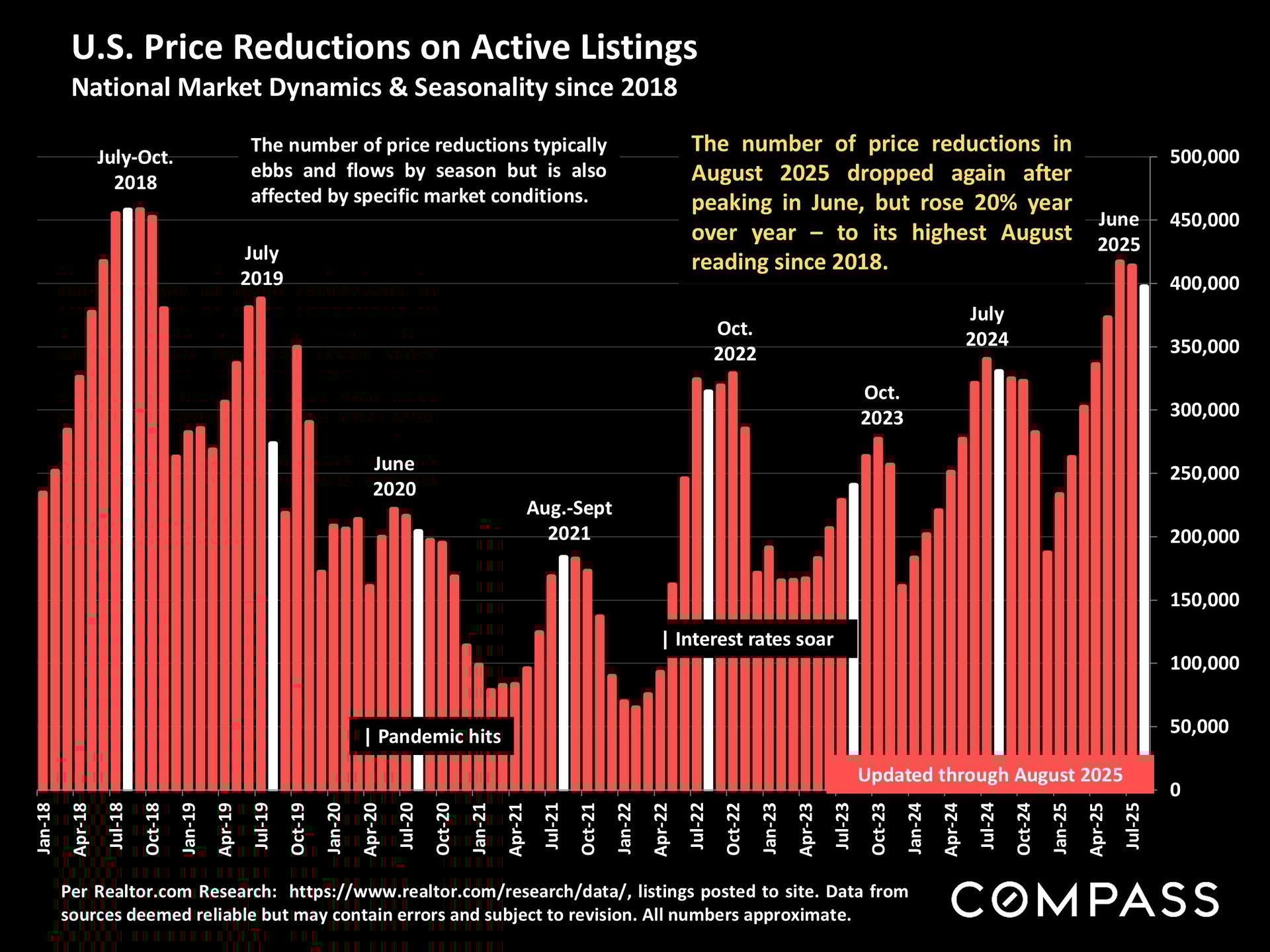 After reaching a multi-year high in April 2025, new listings have slowed, though they remain about 5% higher than last August. Overall, the number of homes on the market is now at its highest level since 2019, up 21% year-over-year as of August.
