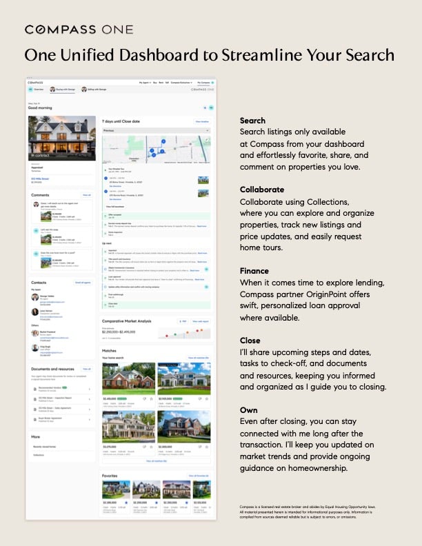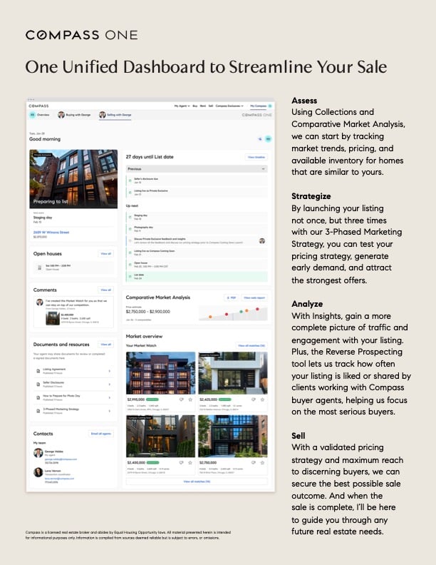 For sellers, Compass One brings every part of the selling process into one intuitive dashboard. From tracking engagement and buyer interest to monitoring market activity, next steps, and key milestones, you’ll have full transparency and confidence throughout your sale, without the guesswork.